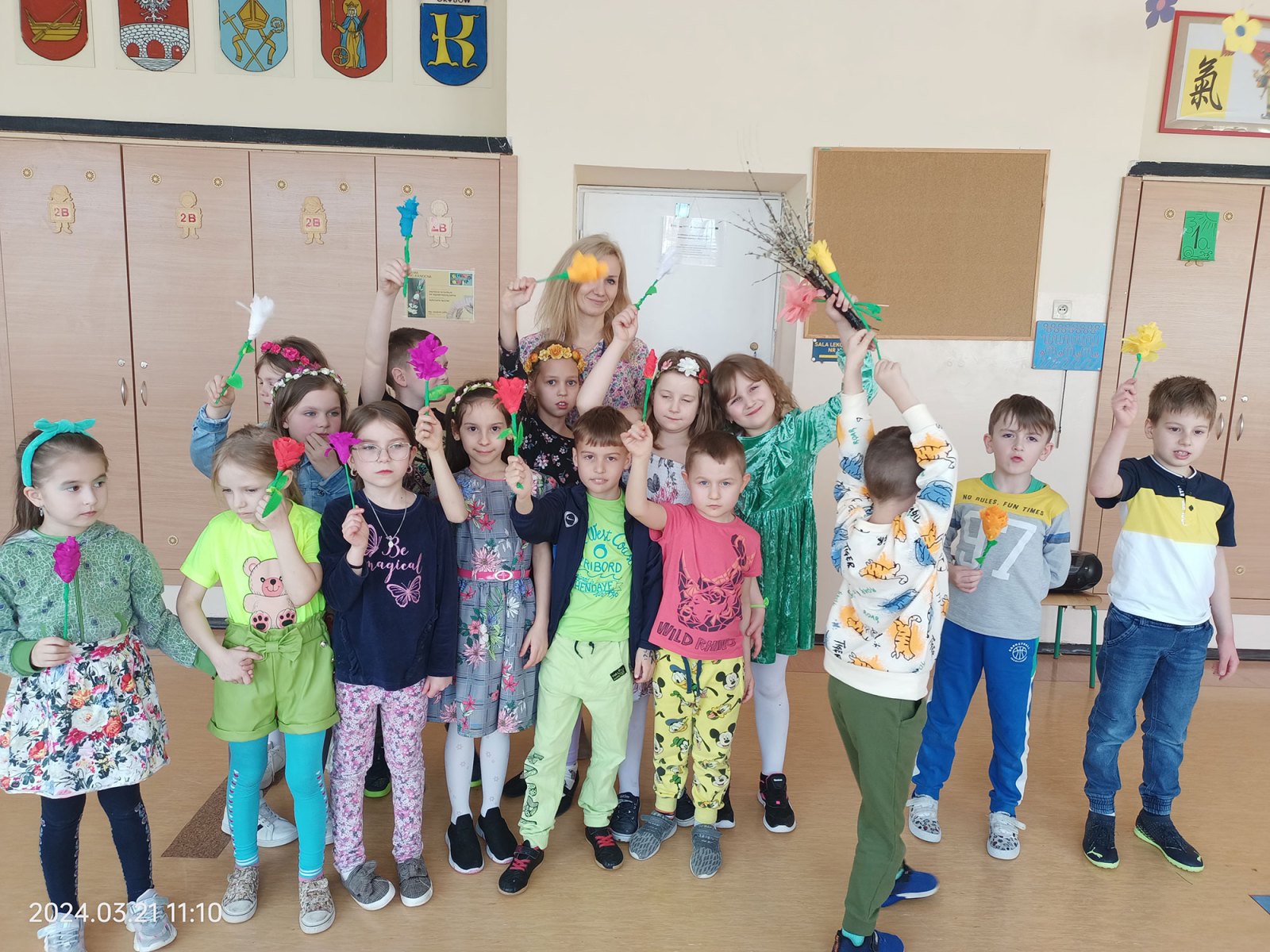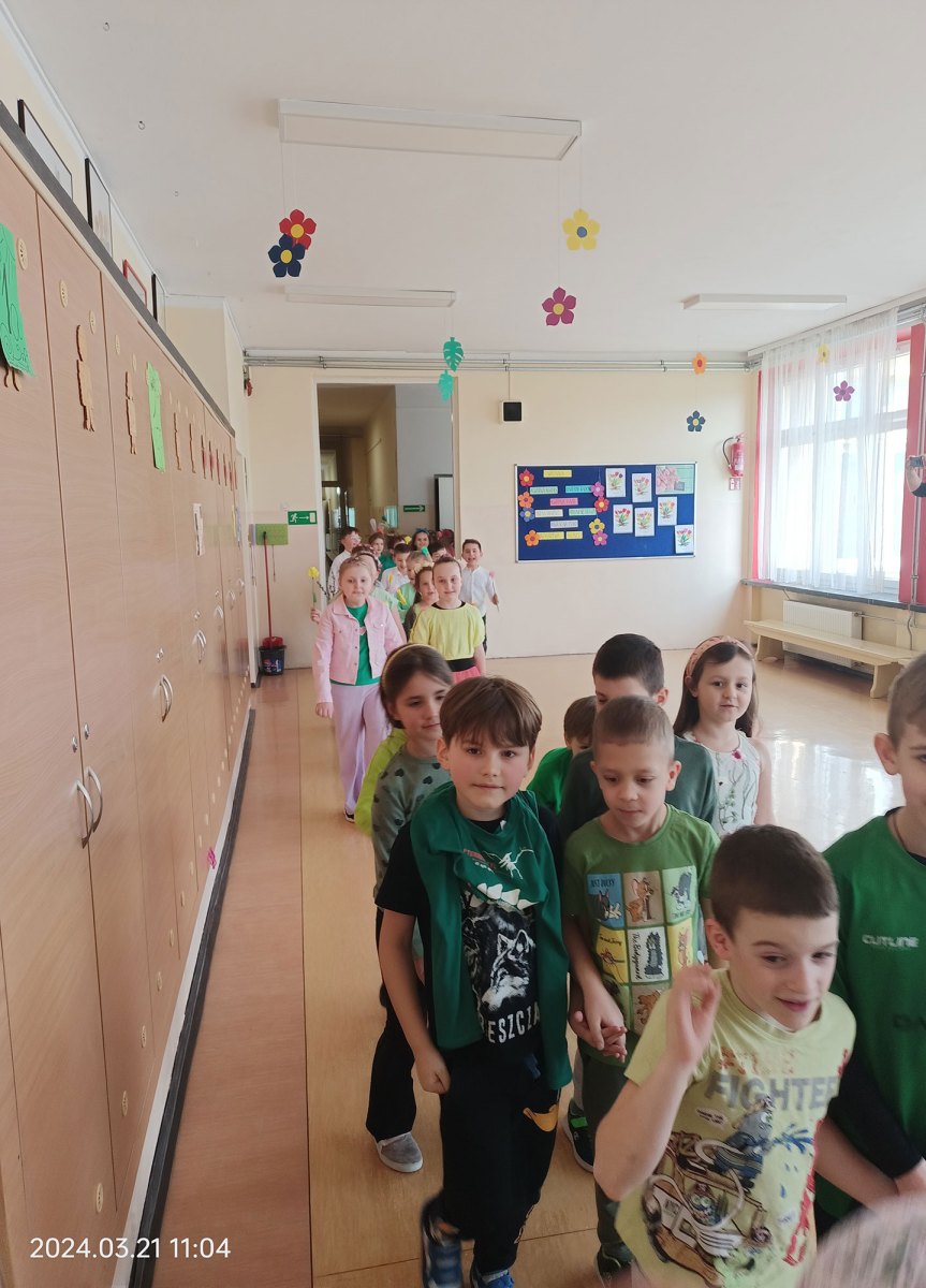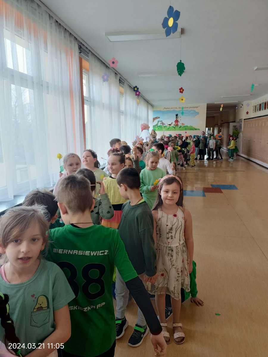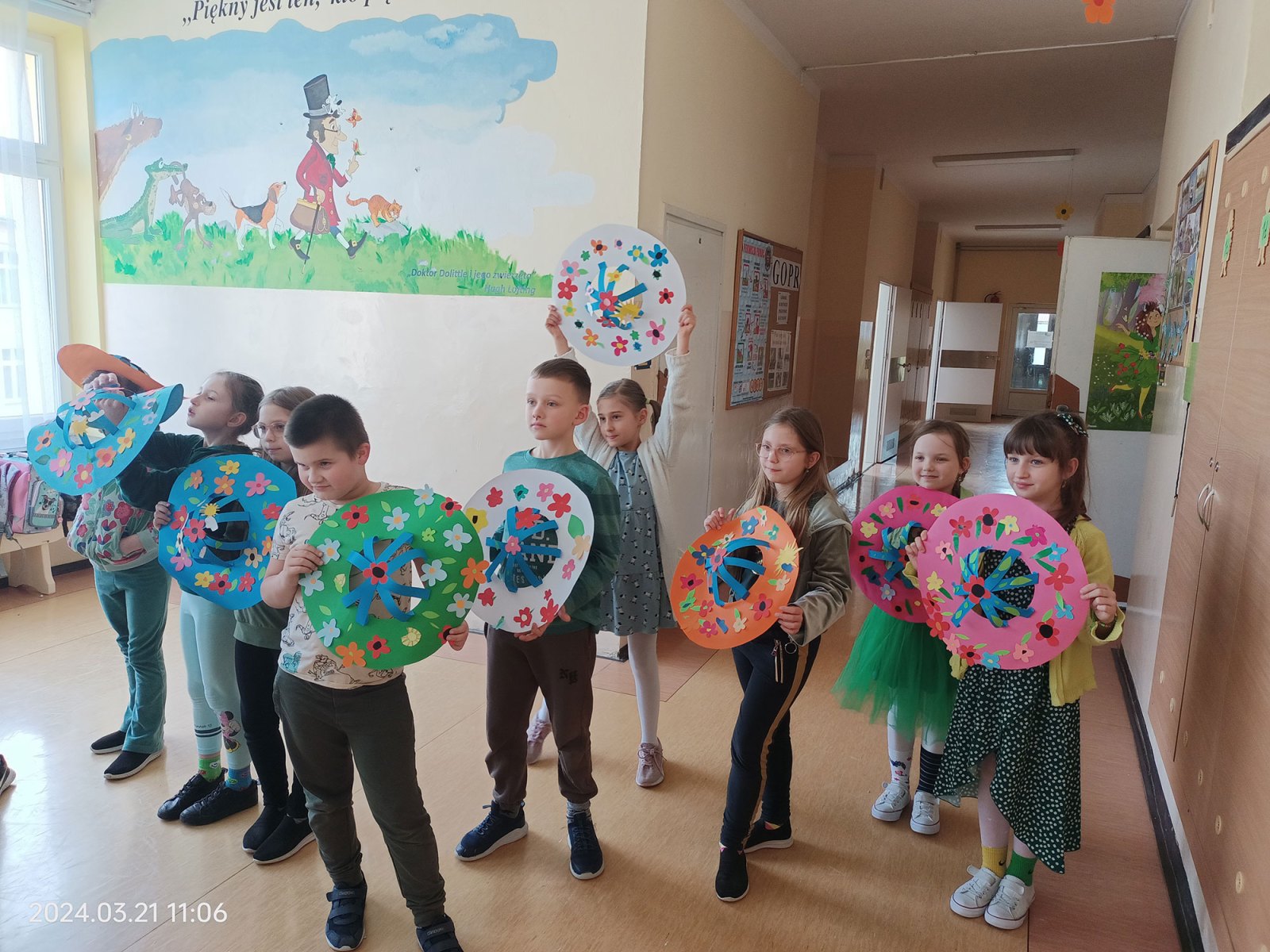 21 marca 2024r. w naszej szkole nie dało się nie zauważyć przybycia wiosny. Na gazetkach ściennych dominowały zwiastuny wiosny i jej kolory. Już od rana na szkolnych korytarzach można było spotkać uczniów, którzy, zamiast do plecaków, zapakowali podręczniki oraz przybory szkolne do niezwykle kreatywnych „pojemników”. Można było również podziwiać iście wiosenne stylizacje w kolorze zielonym, wianki i kapelusze. Przed południem przeszedł przez szkołę kolorowy korowód najmłodszych uczniów z wiosennymi kwiatami w dłoniach, którzy głośno żegnali zimę, a witali wiosnę.