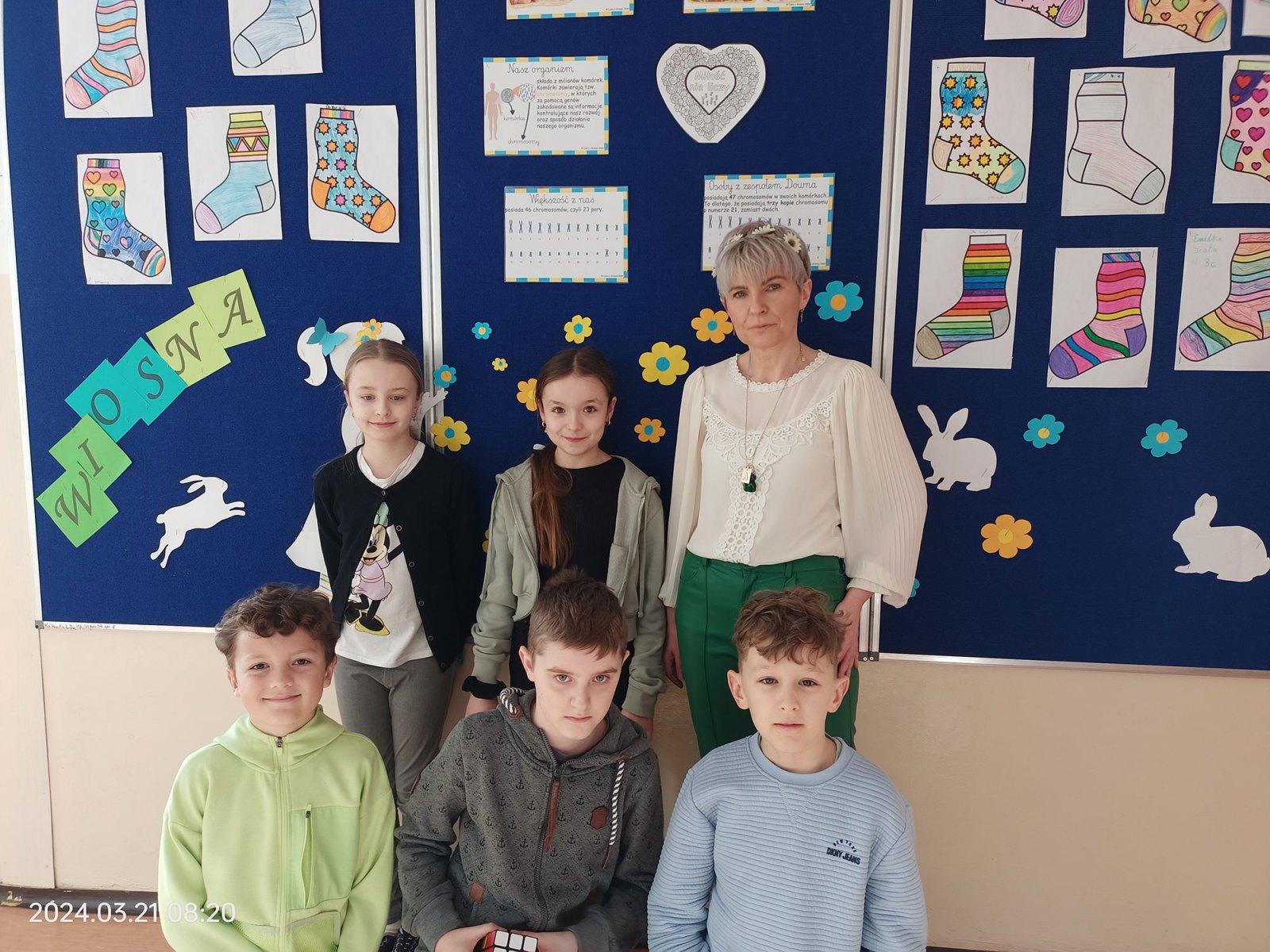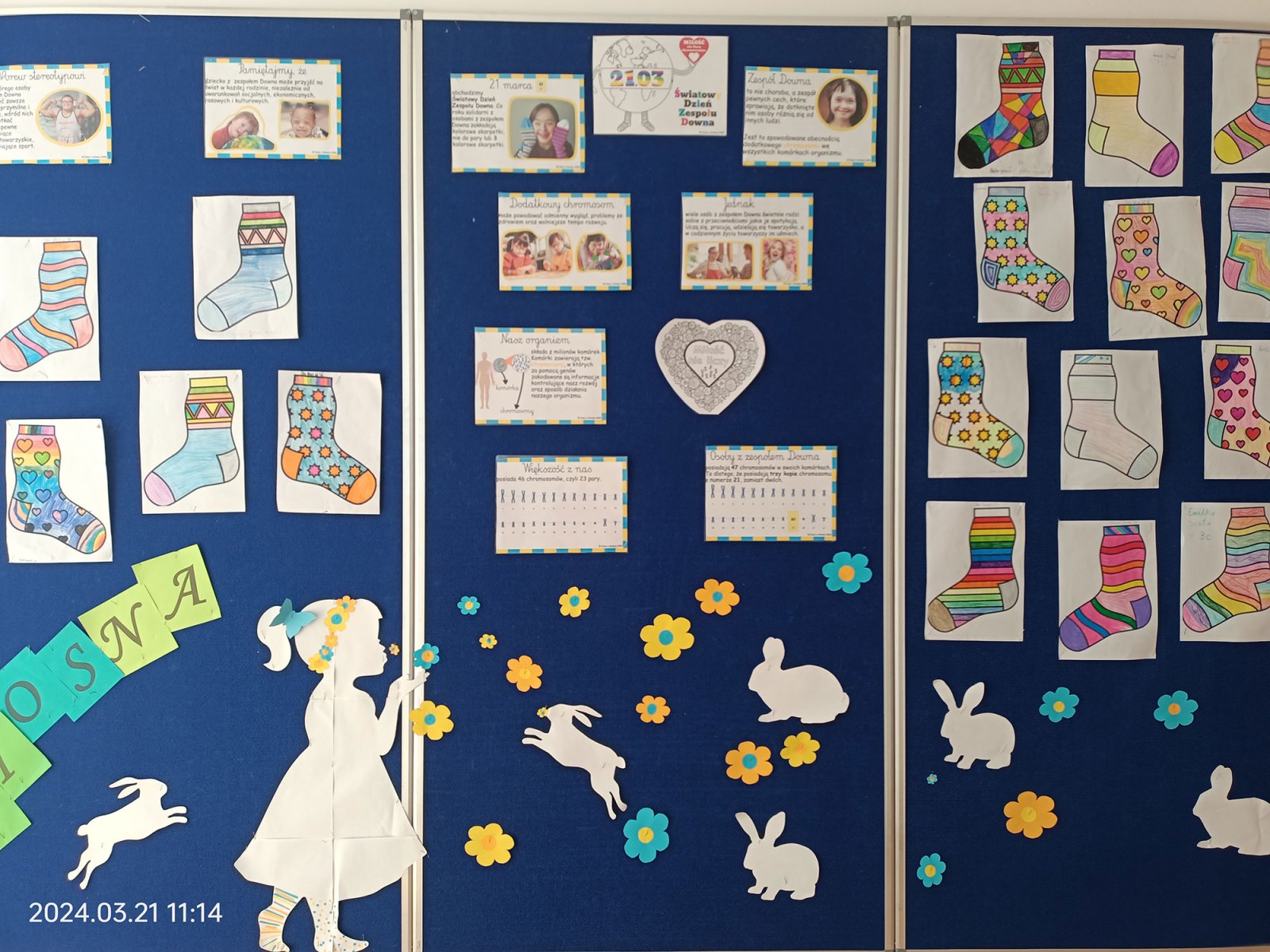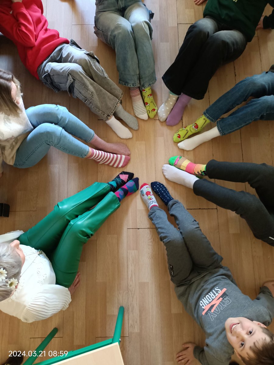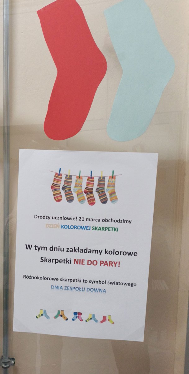 W naszej szkole tradycyjnie zostały rozwieszone plakaty informacyjne, uczniowie włożyli kolorowe skarpetki nie do pary, a maluchy wykonały kolorowe skarpetki z papieru. Poza tym wychowawcy przeprowadzili pogadanki z dziećmi i młodzieżą o możliwościach oraz ograniczeniach osób z zespołem Downa, często wykorzystując udostępnione propozycje filmików, np. Nie bój się myśleć inaczej. Akcję koordynowały Panie: Ewelina Borusiewicz, Paulina Radzik oraz Aneta Korzeniowska.