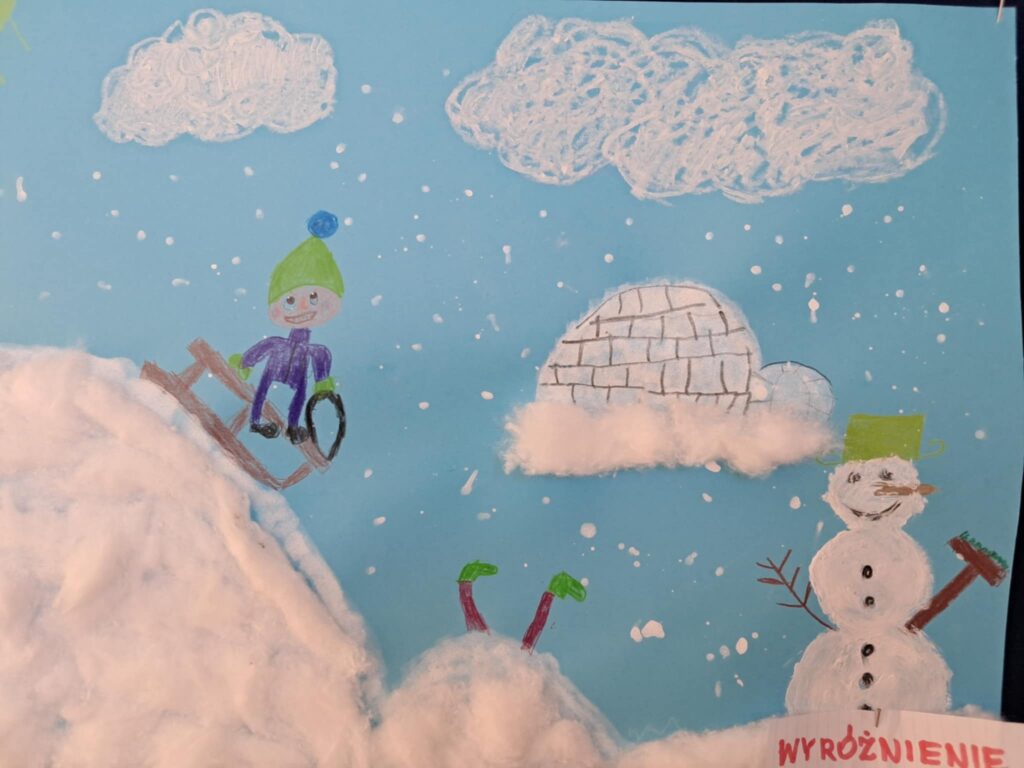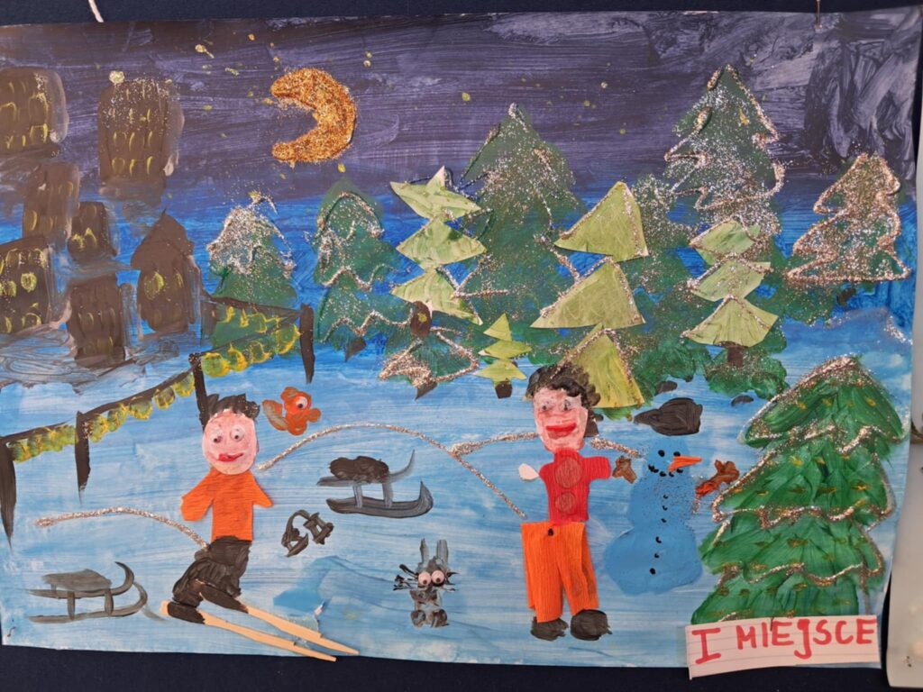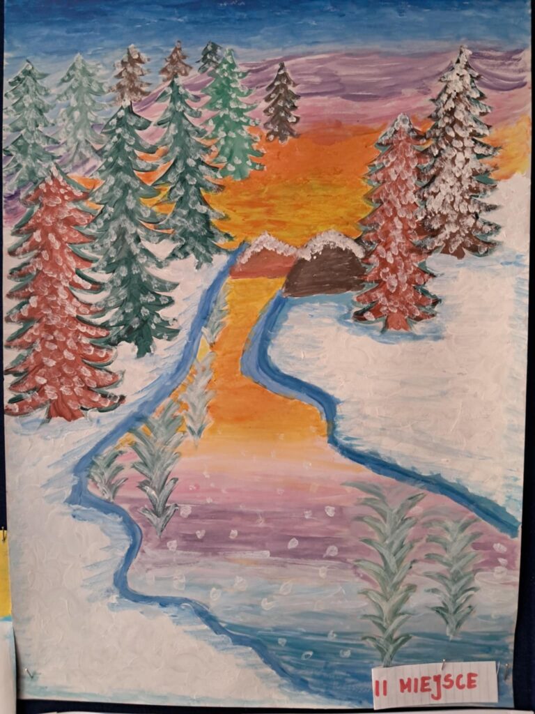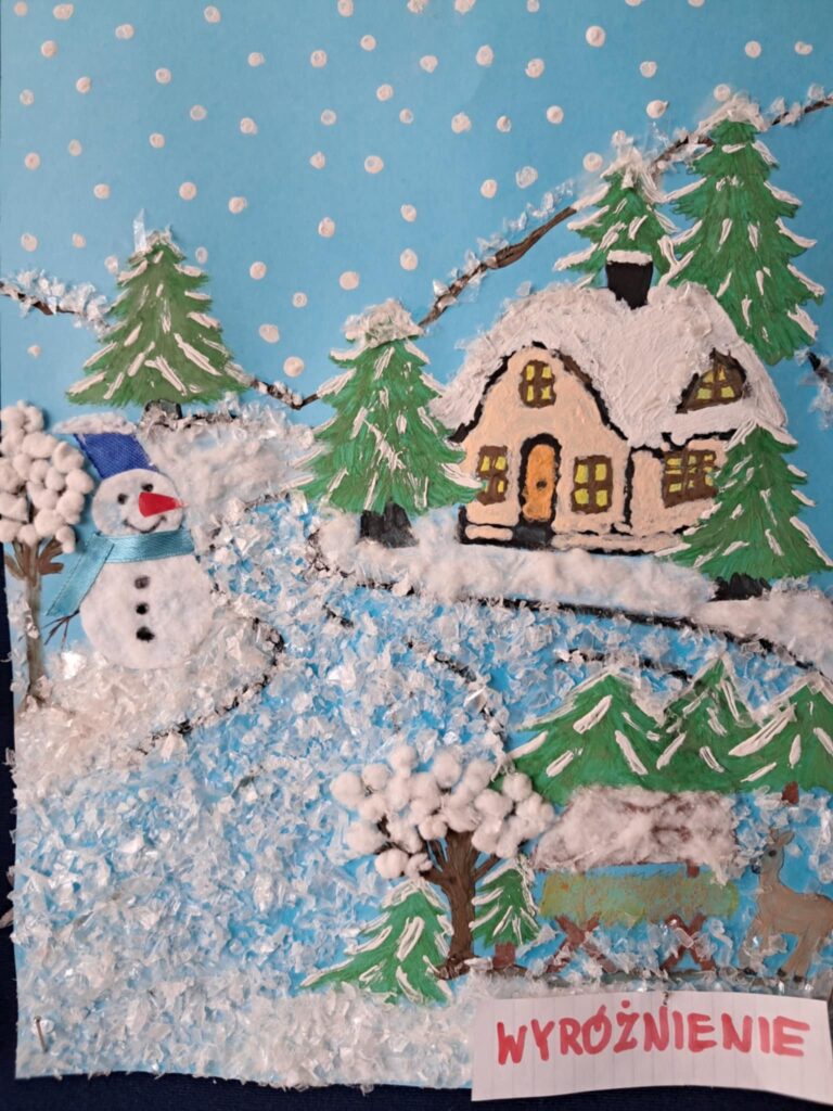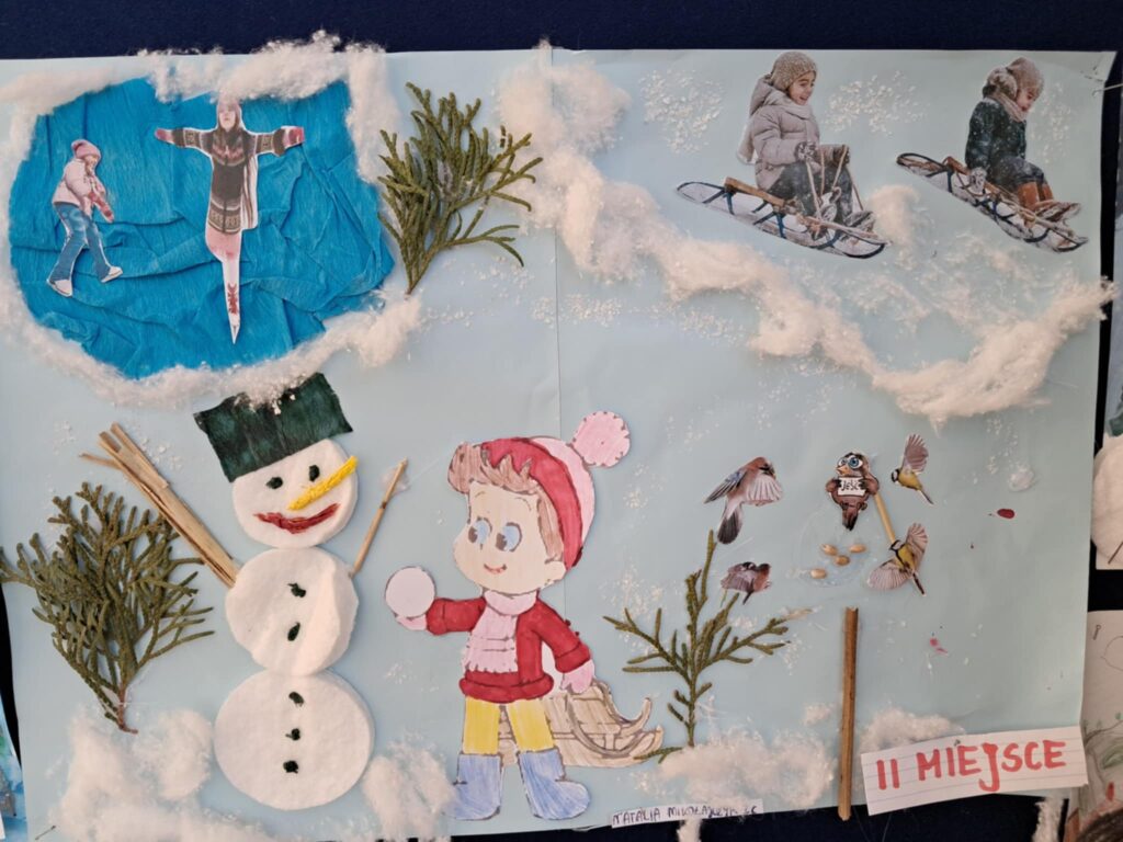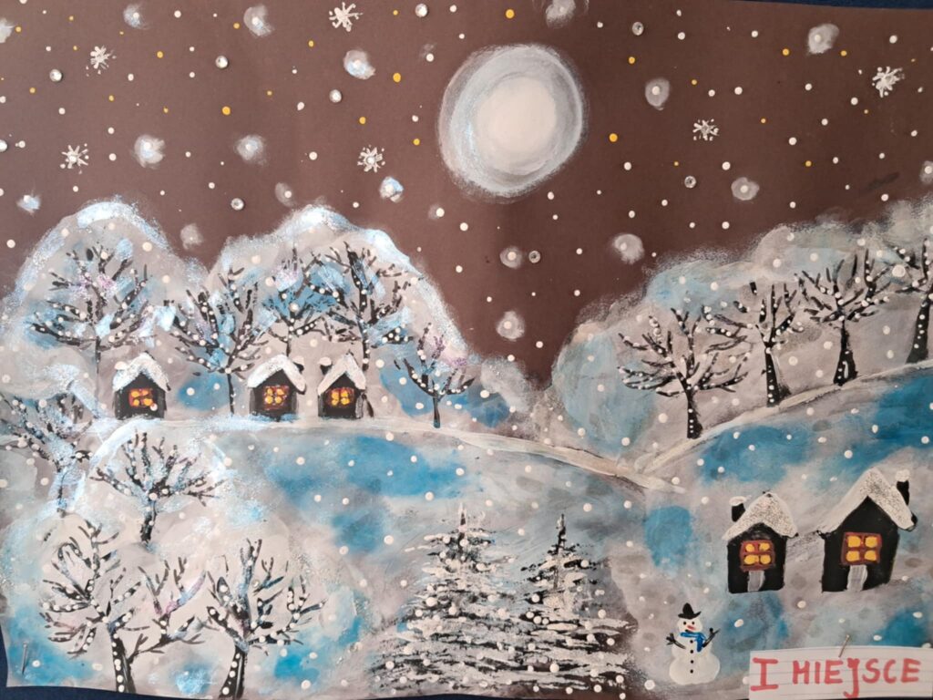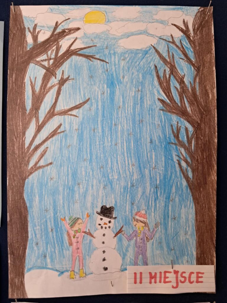 W lutym 2025 roku został zorganizowany w naszej szkole konkurs plastyczny, przeznaczony dla uczniów klas 1-3 pt.”Zima jak z bajki”.